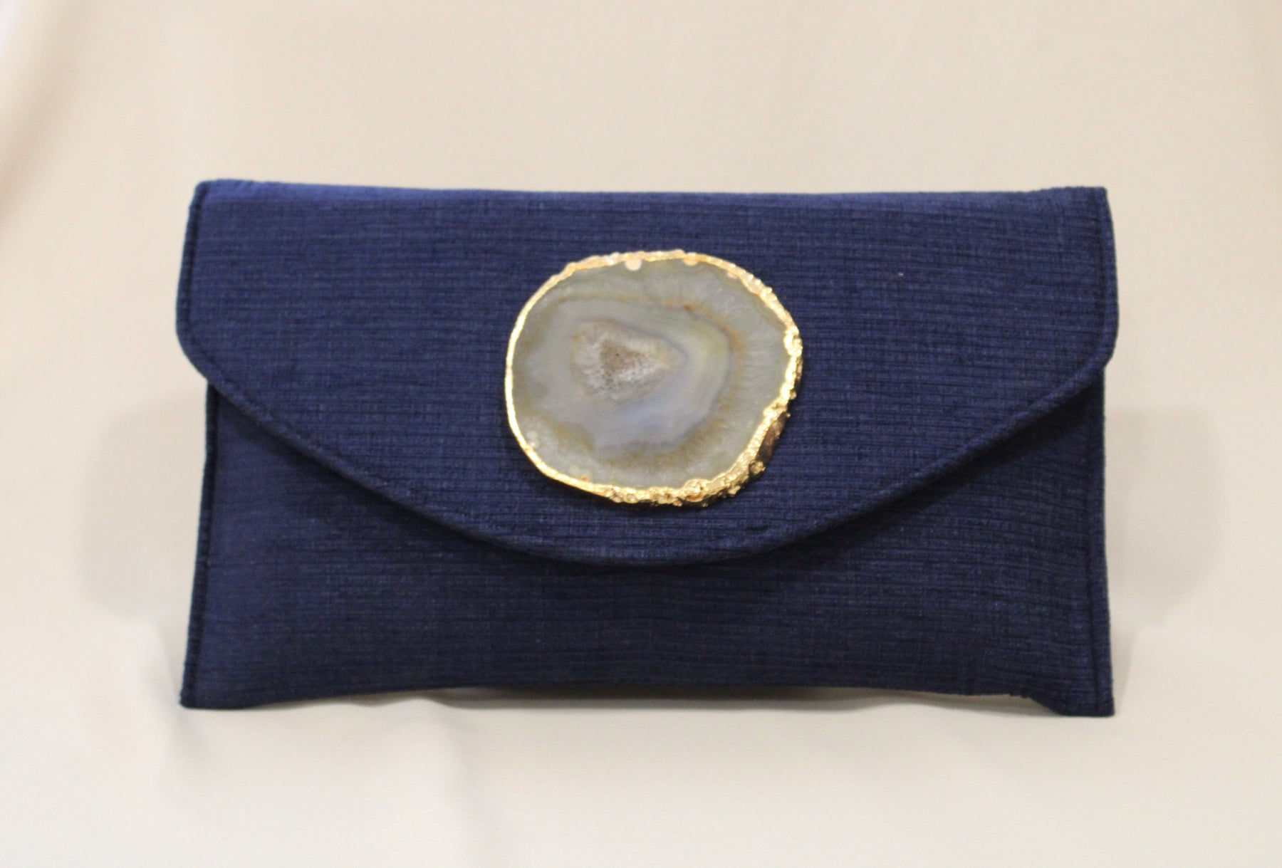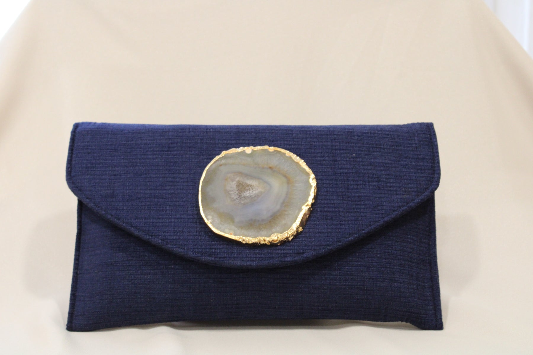 Confeccionado en tejido de textura trenzada color azul marina ofrece un aspecto sofisticado y natural ideal para ocasiones especiales. Su diseño destaca por un broche central decorativo con acabado dorado y piedra acrílica, que aporta un toque distintivo y refinado.