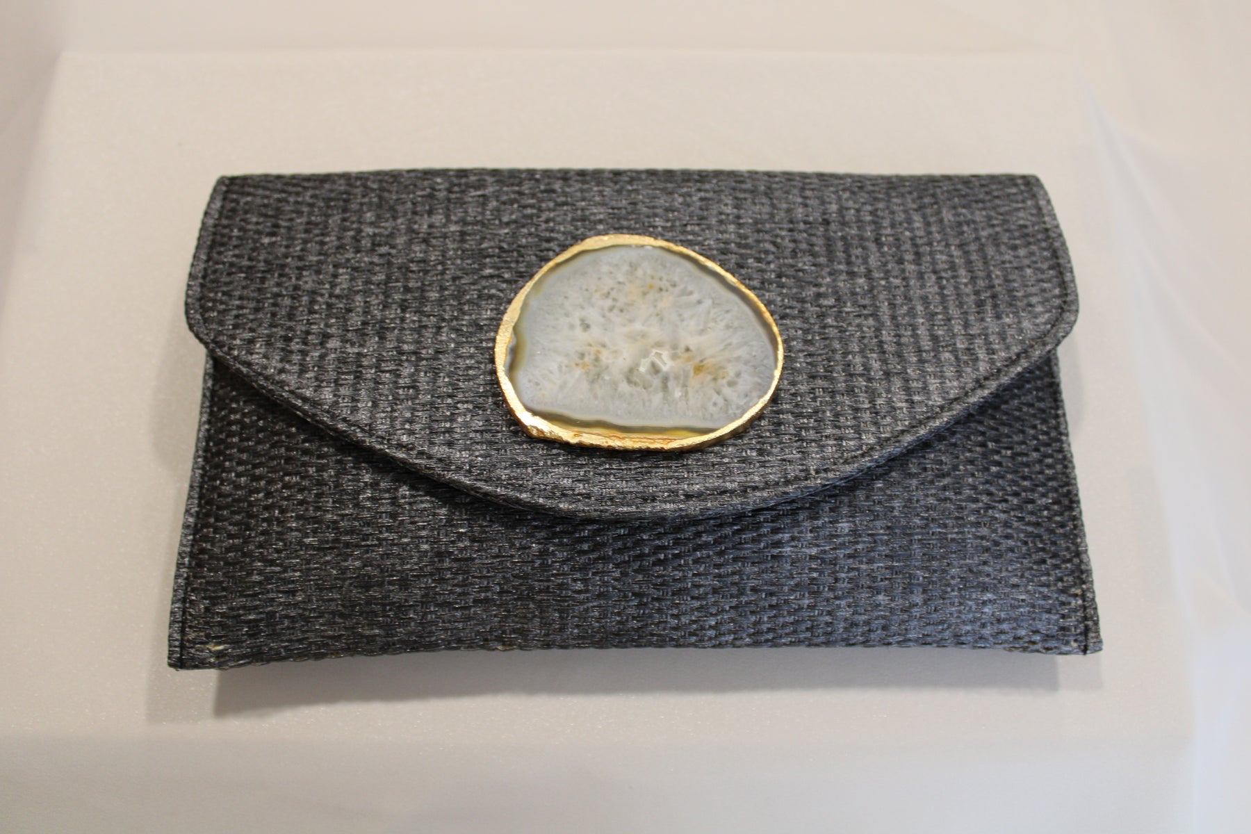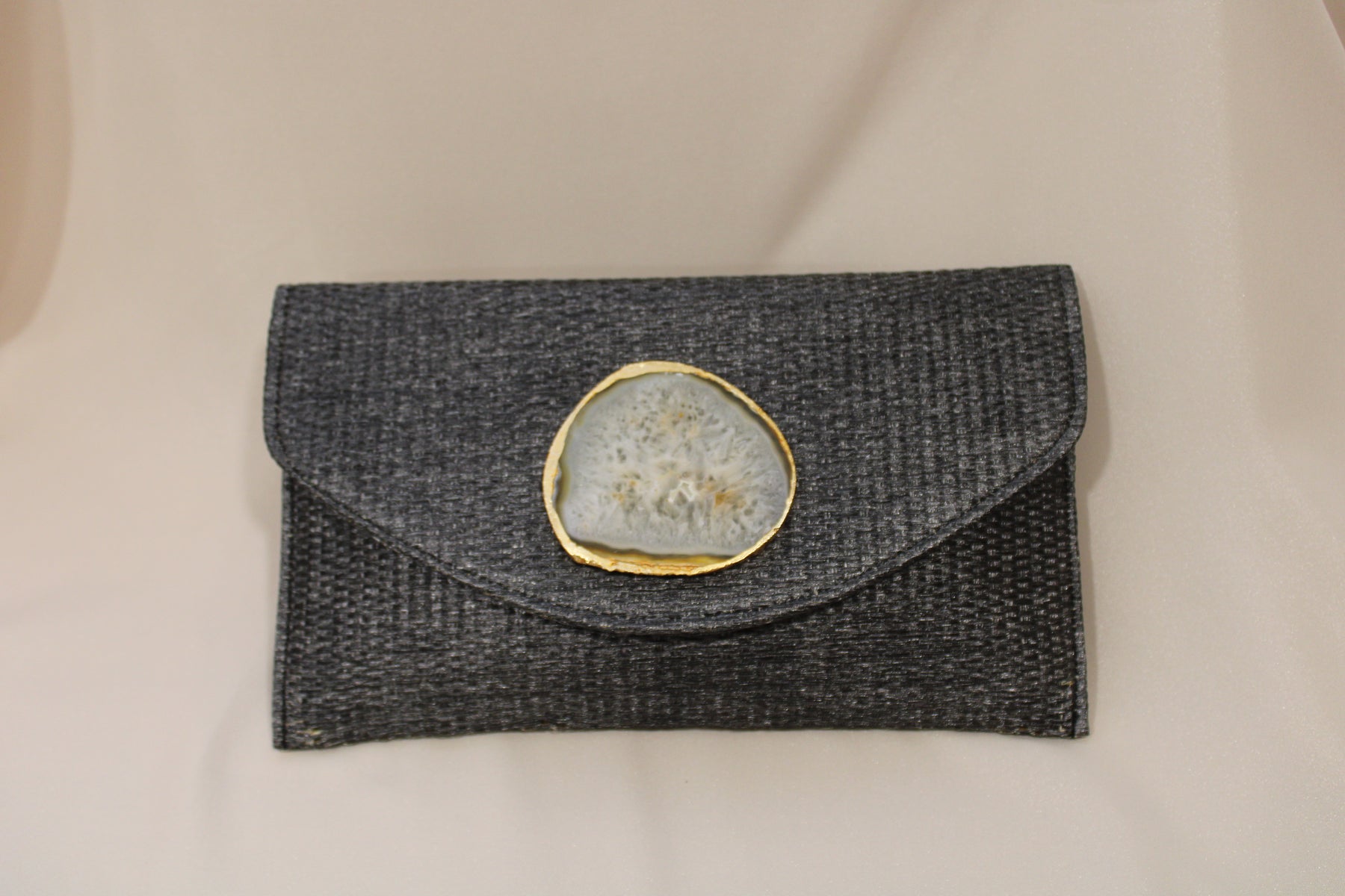 Confeccionado en tejido de textura trenzada color gris ofrece un aspecto sofisticado y natural ideal para ocasiones especiales. Su diseño destaca por un broche central decorativo con acabado dorado y piedra acrílica, que aporta un toque distintivo y refinado.